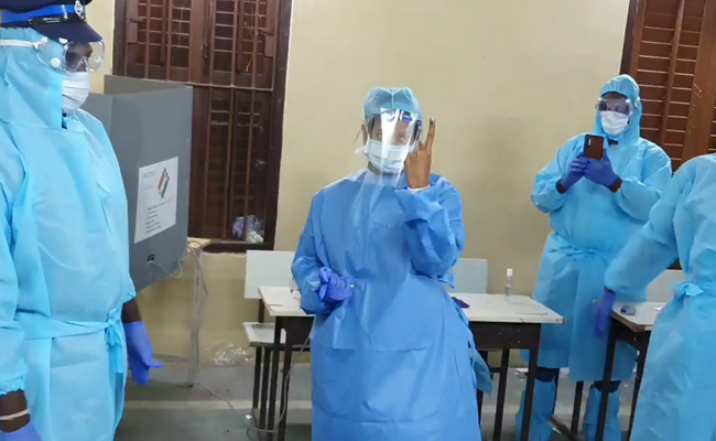 DMK MP Kanimozhi, who tested positive for the coronavirus earlier this month, voted in a PPE (personal protective equipment) suit in south Chennai's Mylapore.