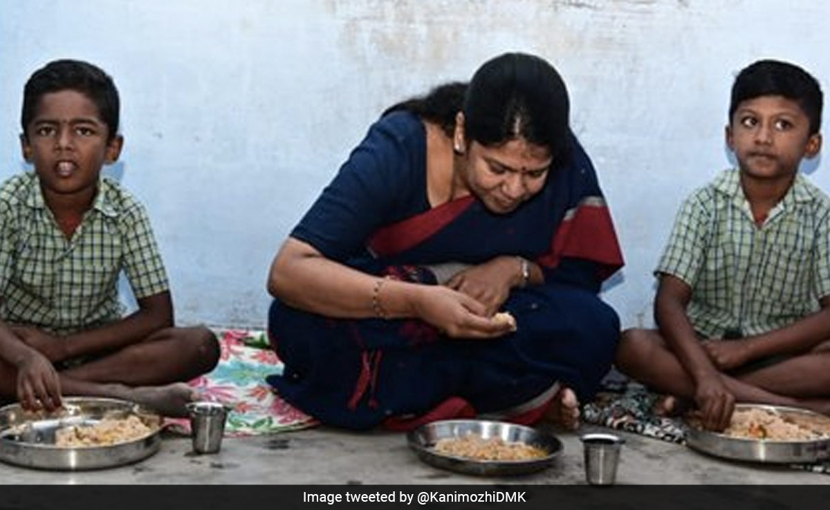 Kanimozhi herself served the breakfast prepared by Muniaselvi to the school children and sat down on the floor and had the breakfast with the children.