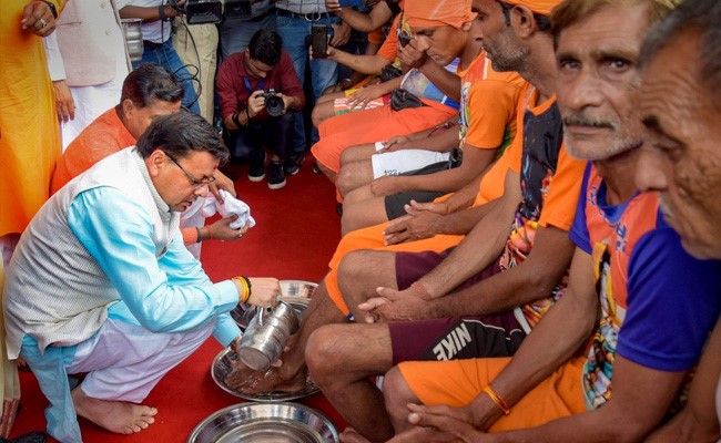 Uttarakhand Chief Minister Pushkar Singh Dhami on Wednesday accorded a warm welcome to Kanwariyas in Haridwar, washing their feet and taking their blessings on the banks of the Ganga in Damkoti.