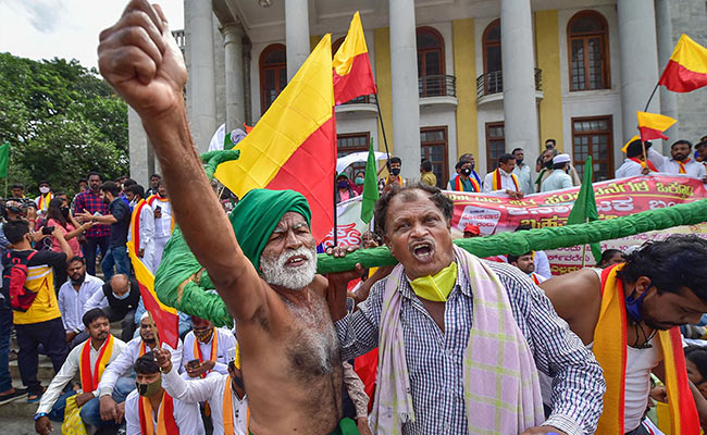 Thousands of farmers across BJP-ruled Karnataka joined the countrywide protest against the new farm laws this morning. Their other grouse was against changes to the land acquisition act -- which makes it easier for non-farmers to buy agricultural land -- and amendments to the APMC (Agricultural Produce Market Committees) Act, which lists rules for procuring farm produce.