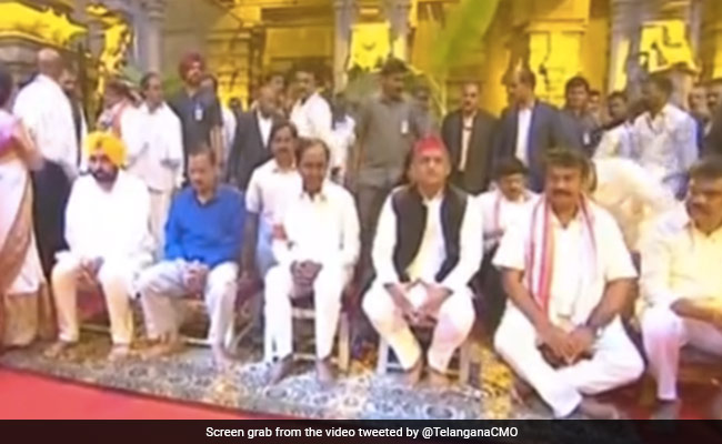 In a video posted by Telangana CMO's Twitter handle, KCR along with Kejriwal, Mann, and the Samajwadi Party chief were seen offering prayers.