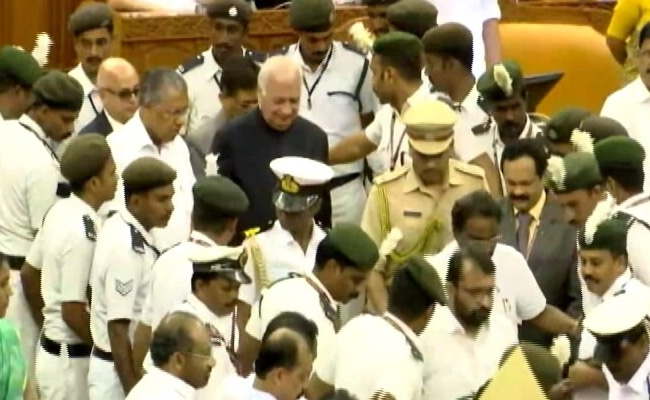 Marshals in the Kerala assembly had to form a human chain to let the governor reach the dais and deliver the speech as opposition MLAs held placards and shouted "Go Back" slogans.
