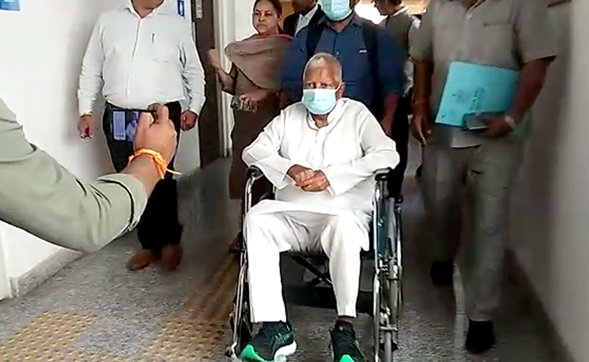 Lalu Yadav arrived in a wheelchair in his first court appearance after a kidney transplant in Singapore three months ago.
