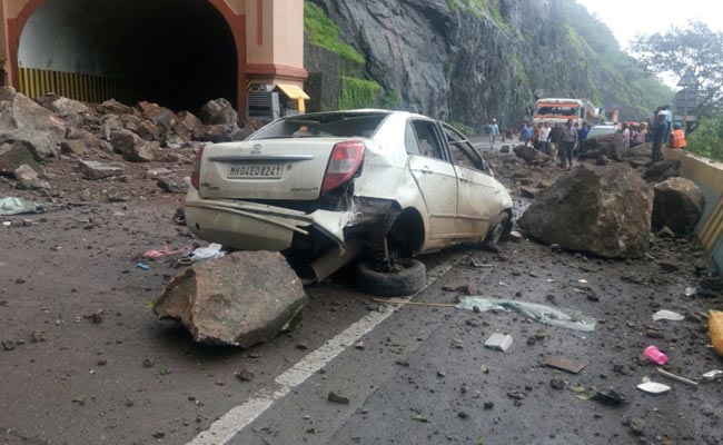 One of the passing cars had been completely smashed after tons of earth and rocks landed on the highway near the Adoshi tunnel, close to Lonavala, blocking a portion of the road.