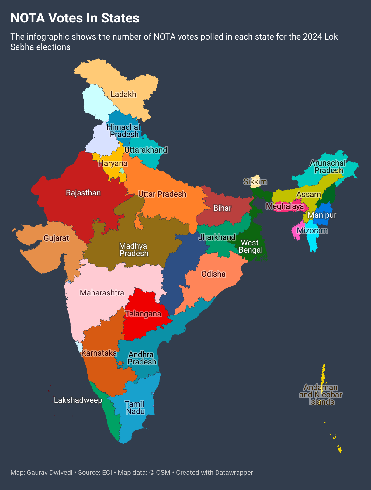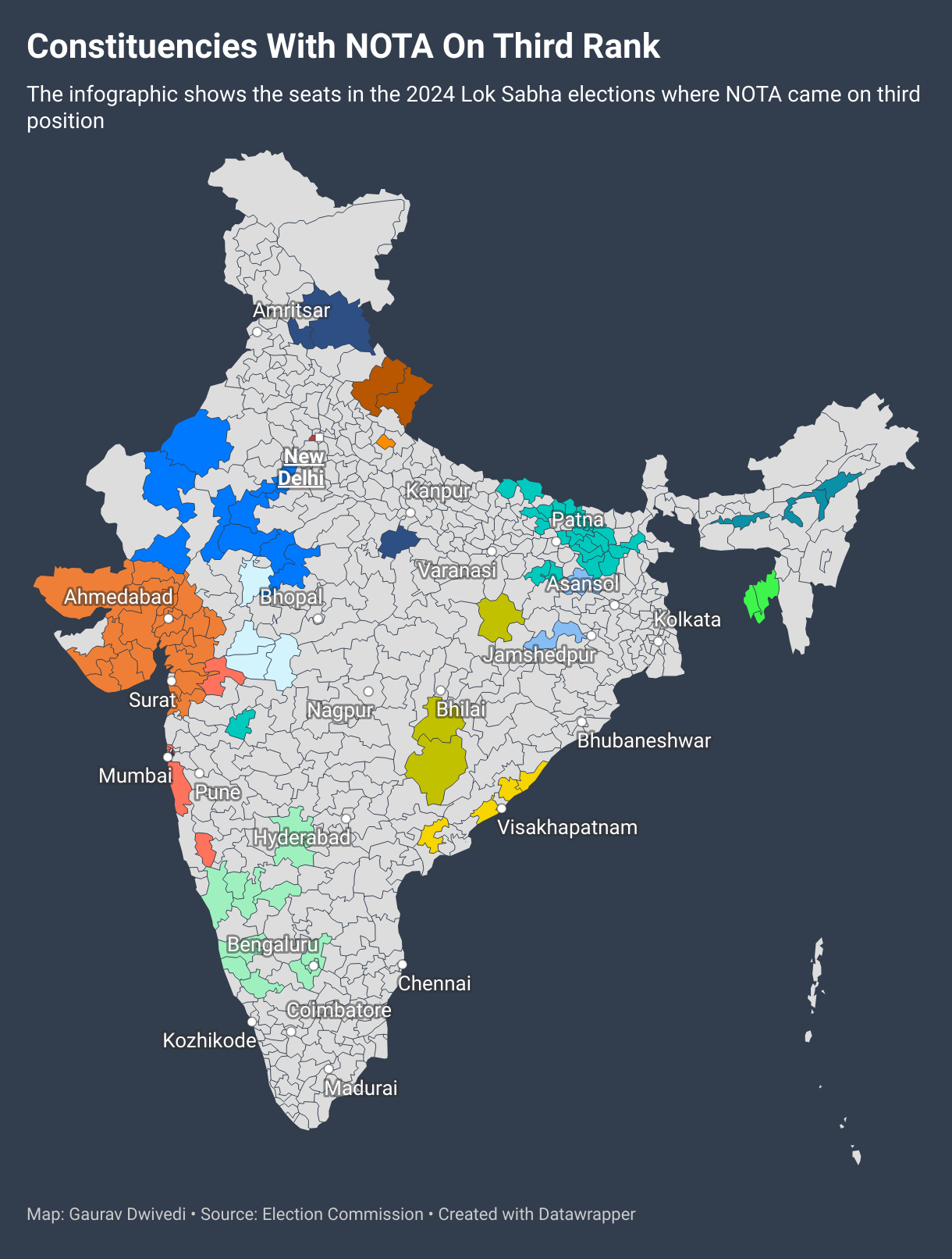 In Bihar, 21 out of 40 seats saw NOTA in the third position, an unusual trend in a state with a multitude of political parties like BJP, Janata Dal, Rashtriya Janata Dal, and Lok Janshakti Party. Gopalganj led with 42,863 votes, followed by Hajipur with 36,927 and Banka with 34,889 votes. Among others, Madhepura recorded 32,625 NOTA votes. Bihar had the most NOTA votes cast, with 2.07 per cent of voters opting for it.