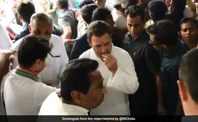 Congress President Rahul Gandhi on Monday relished a samosa and sipped tea at a roadside eatery while campaigning in the old city area in Bhopal for the upcoming Madhya Pradesh assembly elections.