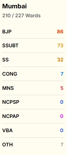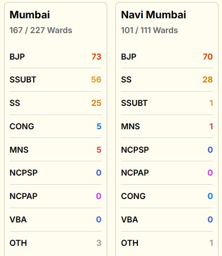 Current trends show that the BJP-led Mahayuti alliance is leading in 116 wards of the total 227 in the BMC election in Mumbai, while the Shiv Sena (UBT)-led alliance is leading in 85 wards.
