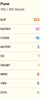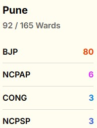 The Bharatiya Janata Party (BJP) is leading in 48 of 165 wards in Pune, while NCP (Ajit Pawar) is leading in 14 wards.