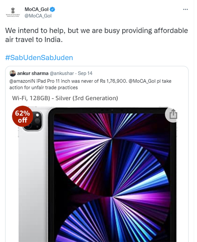 "iPad Pro 11 inch was never of Rs 1,76,900. @MoCA_GoI pl take action for unfair trade practices," he tweeted, perhaps intending to tag the Ministry of Consumer Affairs.