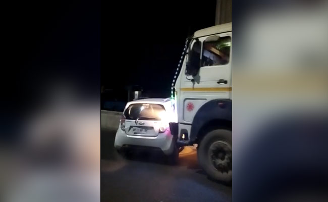 A huge 22-wheel container truck hit a car in Meerut and then dragged it for about 3 kilometres as bystanders looked on in shock.