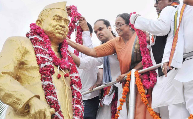 Meira Kumar garlanded the statue of her father Babu Jagjivan Ram in Hyderabad on Monday. (PTI)