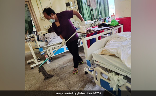 Leading by example, Mizoram's power and electricity department minister R Lalzirliana was on Friday seen mopping the floors of a hospital, where he is undergoing treatment for COVID-19 along with his wife and son.