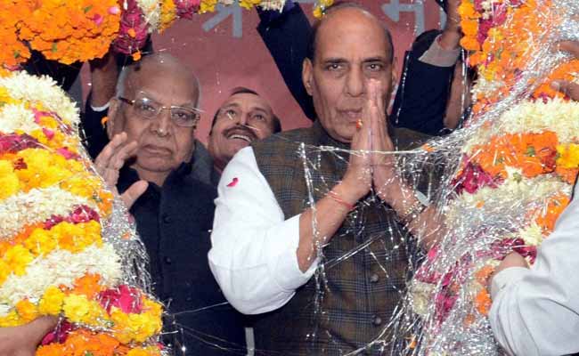Union Home Minister Rajnath Singh is garlanded at BJP workers meeting in Lucknow on Saturday, December 26, 2015. (Press Trust of India photo)
