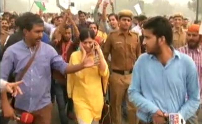Angry protesters surrounded NDTV's Bhairavi Singh, who was reporting on the march to the Rashtrapati Bhavan, and verbally abused her. The reporter and her crew were also pushed around and slogans were raised before a police team managed to intervene and escort her to safety.