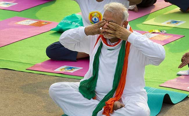 Soon after addressing the gathering, PM Modi climbed down from the podium to join over 35,000 participants to perform 'asanas'.