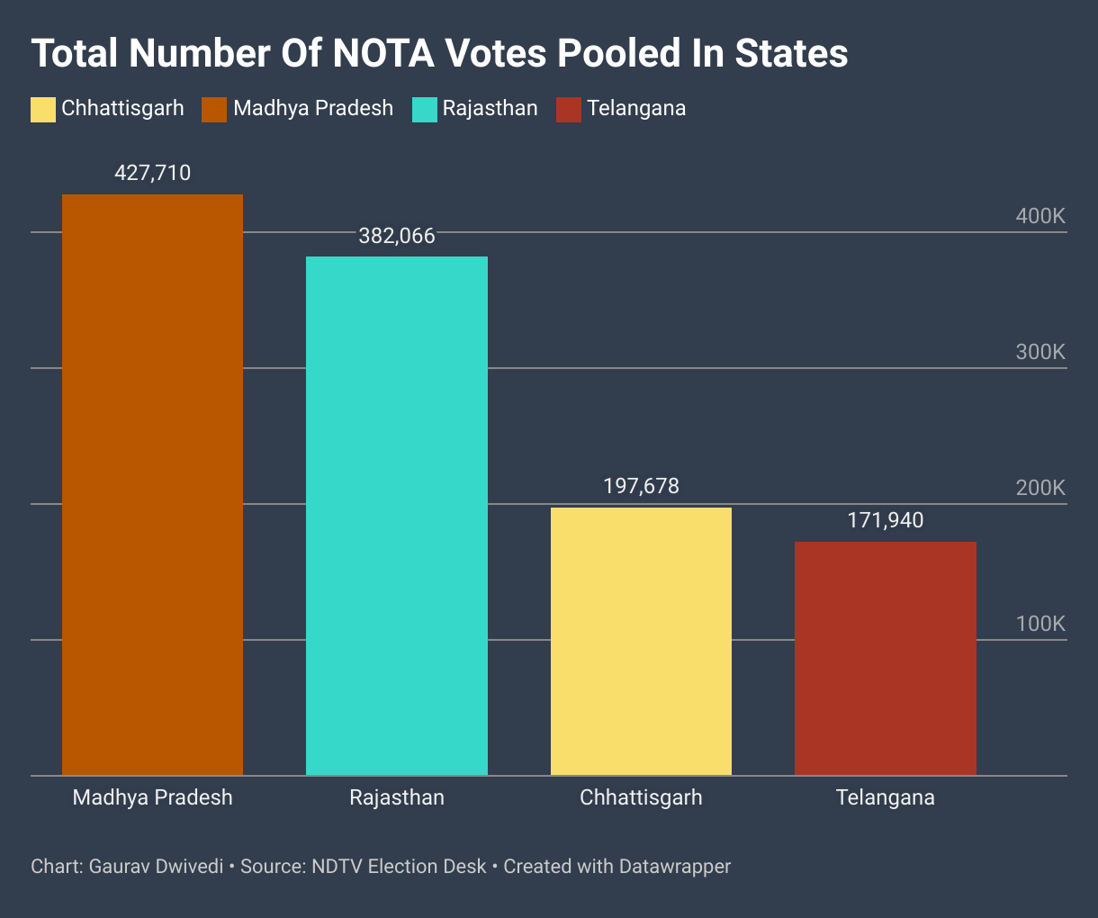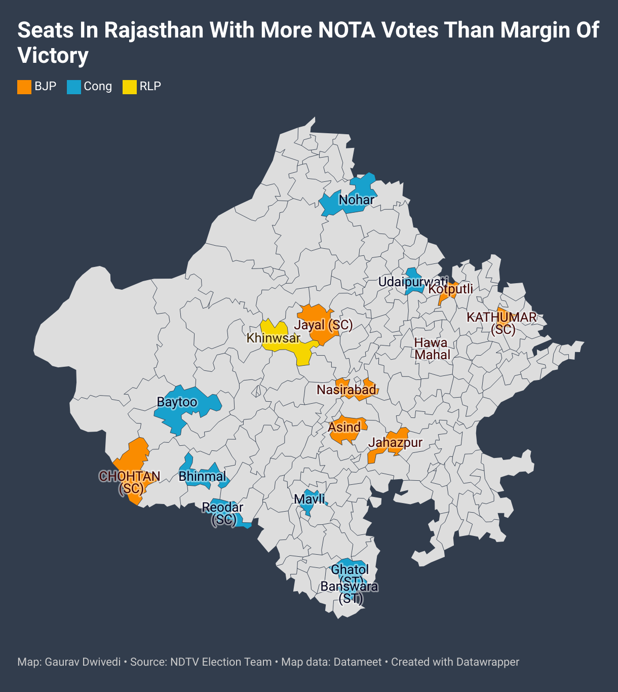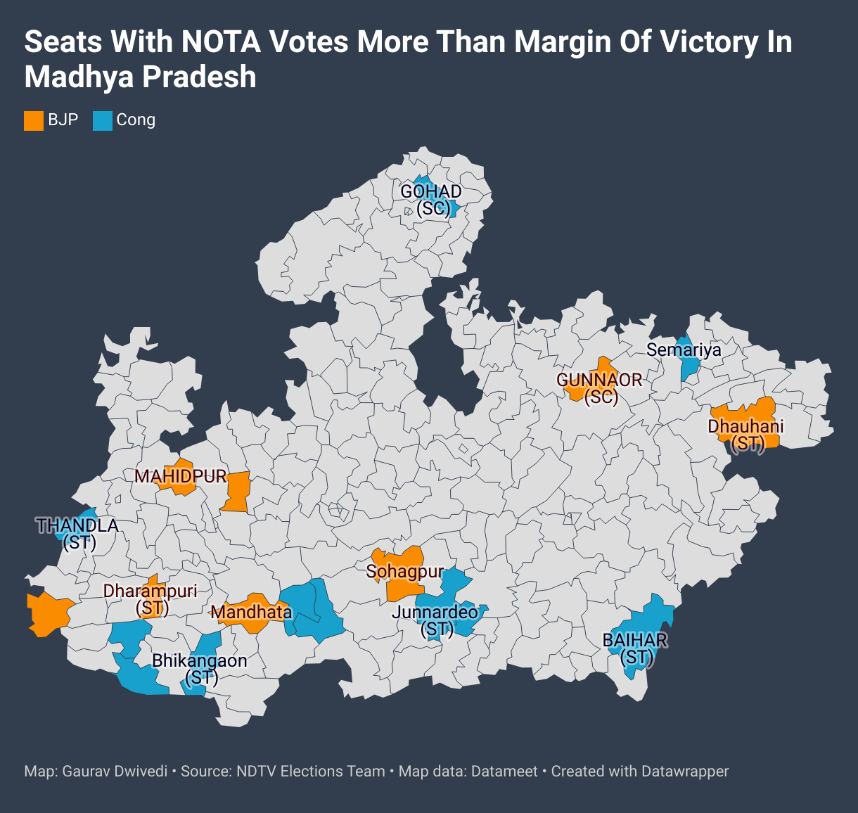 The central state of Madhya Pradesh witnessed NOTA playing a critical role in 20 constituencies, of which Congress won 13 and BJP 7.
