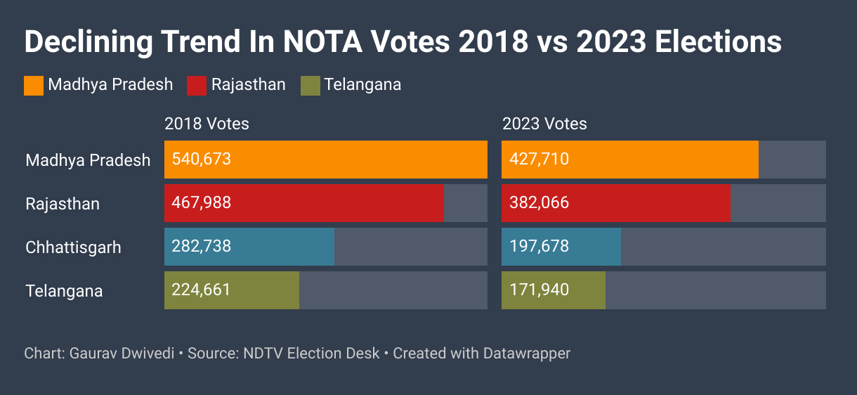 Interestingly, despite its capacity to alter election results, NOTA's overall vote share has seen a decline. From 1.41 per cent in the 2018 polls to 0.97 per cent in the recent elections, the drop indicates a shift towards more decisive voting or perhaps voter education about NOTA's implications.