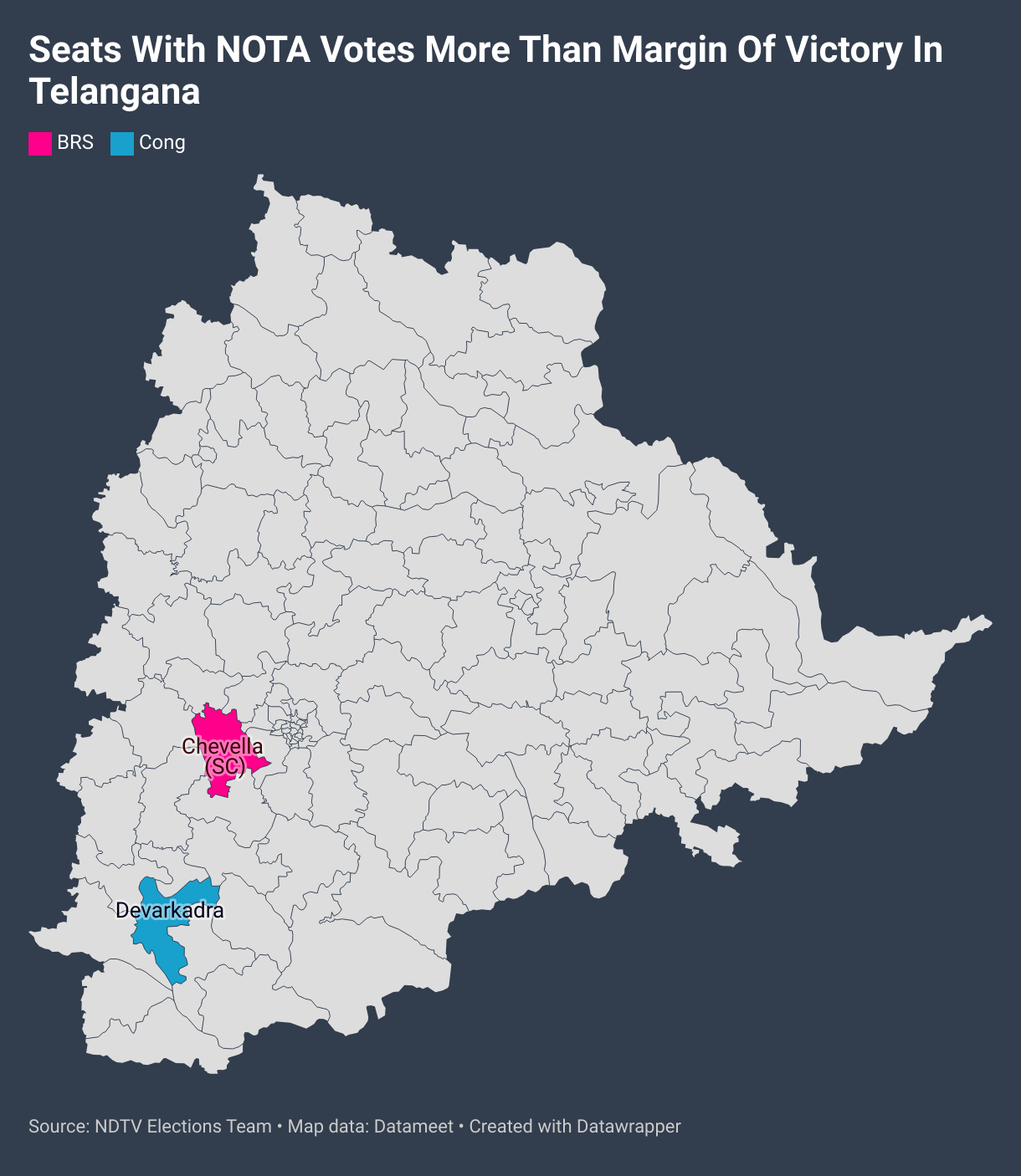 Telangana's political landscape saw NOTA's subtle yet significant presence in two constituencies. The BRS secured Chevella by a margin of 268 votes, with NOTA votes numbering 1,432, potentially altering the result had the NOTA option not been available. In Devarkadra, the margin was 1,392 votes, closely followed by 1,706 NOTA votes.