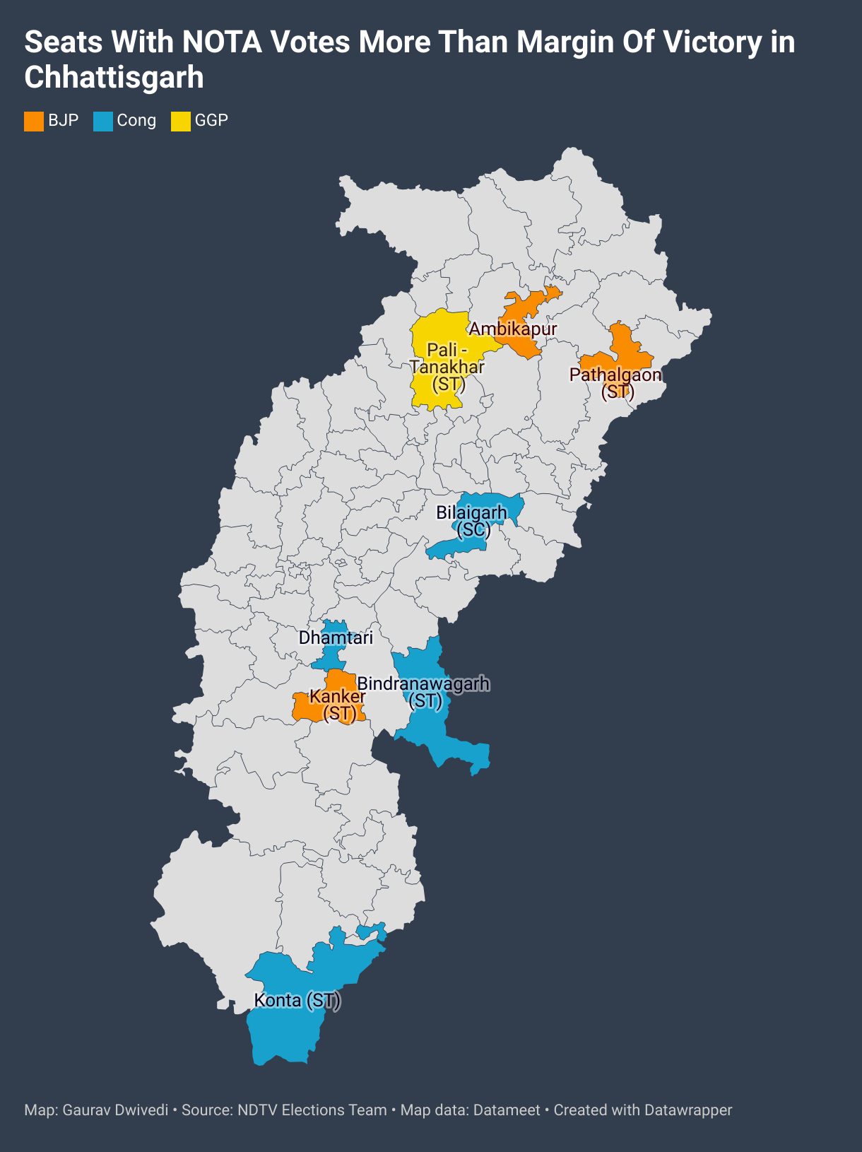 Chhattisgarh presented a nuanced tale where in 8 assembly seats, where NOTA votes exceeded the victory margins. Meanwhile, seats like Ambikapur and Kanker where margin of votes stood at 16 and 94, NOTA votes exceeded the number by 38x times, i.e. 2,729 and 2,168 respectively. The state's average margin of winning stood at 1,149 votes while the average NOTA votes stood three times more i.e. 3,164.