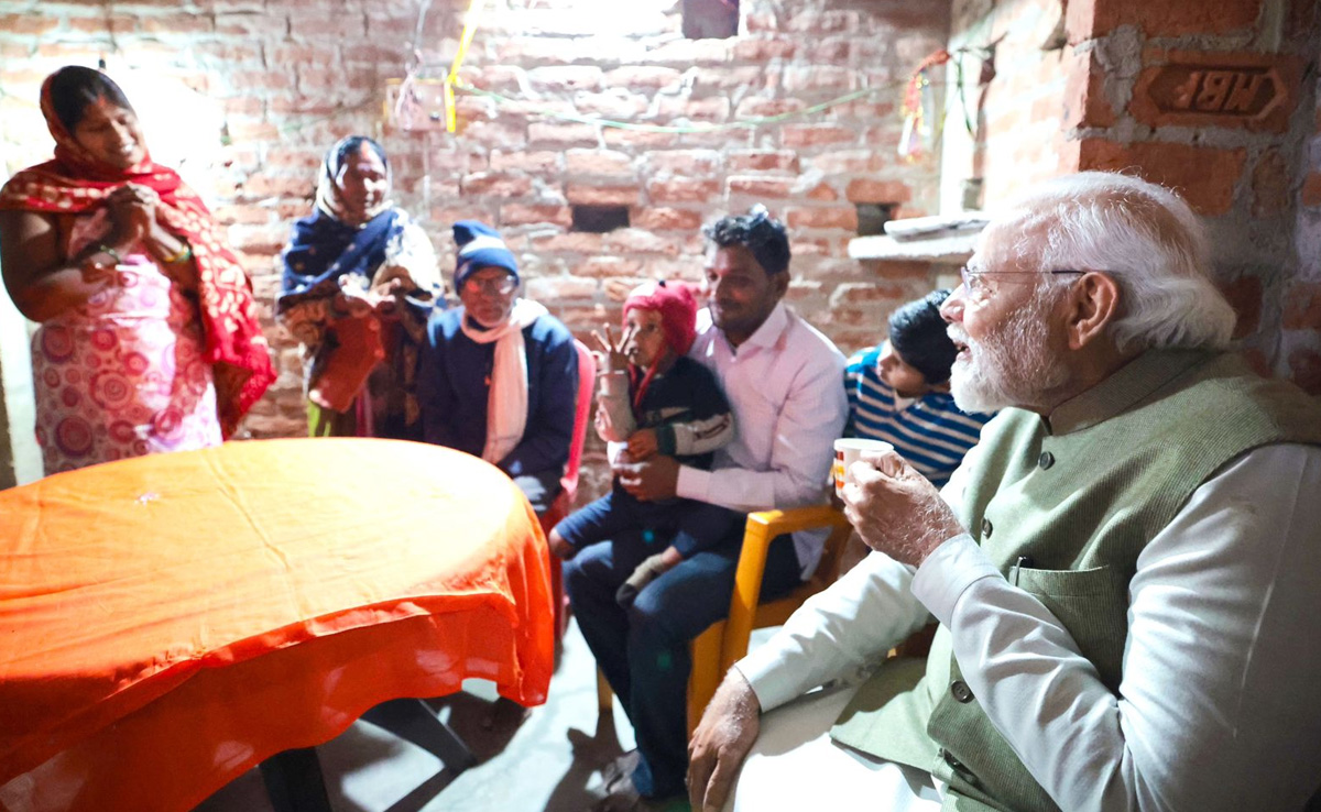 PM Modi was offered tea at the home of the beneficiary of the flagship scheme that provides clean cooking fuel such as LPG cylinders to rural and deprived households, which otherwise had been using firewood, coal, and cow-dung cakes.