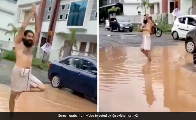 In the clip, local MLA UA Latheef is also seen reaching the spot where Mr Porali is staging his unique protest. As the MLA's car approaches, the man is seen sitting in a meditating pose in the pothole. He was also recorded doing a yoga pose, again standing in the middle of a huge pothole of mud water, before the MLA.