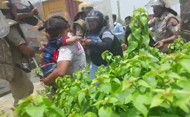 A man struggled to hold up a child as a family sought to escape stone-throwing by protesters against the Agnipath defence recruitment scheme in visuals from Mathura on Friday. People could be seen running for cover behind the police in the video from the Uttar Pradesh town as young men continued their angry demonstrations across several states.