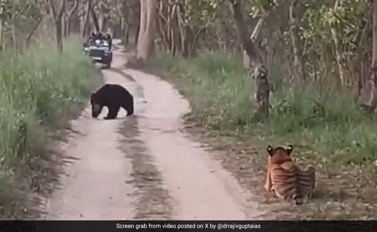 A video shared by a retired Indian Administrative Service (IAS) officer Dr Ravi Gupta has captured "rarest of the rare" sights between a tigress and a bear in Pilibhit Tiger Reserve in Uttar Pradesh. In the video, the tigress is seen taking a majestic stroll along a woodland road in the dense forest, as tourists on safari jeeps witness the sight from a distance.