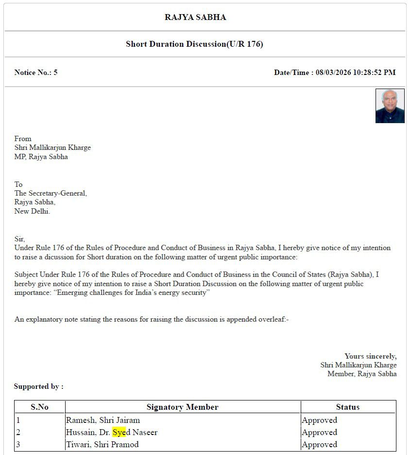 Congress President Mallikarjun Kharge has given a notice to the Rajya Sabha Chairman demanding a discussion on the impact of the war on India's energy security.