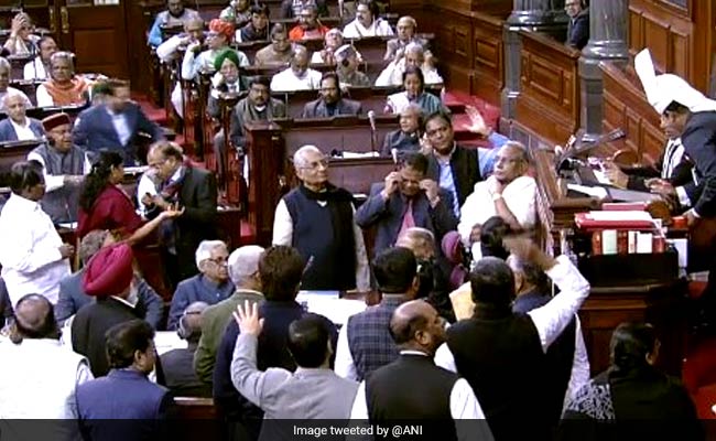 The Opposition reached the well of the House as Union Minister Thawar Chand Gehlot talked about the quota bill, creating an uproar in Rajya Sabha.