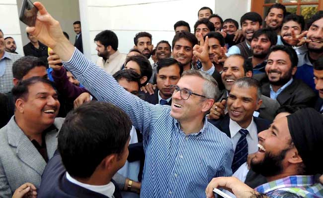 Former chief minister of Jammu and Kashmir and National Conference working president Omar Abdullah taking a selfie with the party's young workers and office bearers in Jammu on Thursday, November 19, 2015. (Press Trust of India photo)
