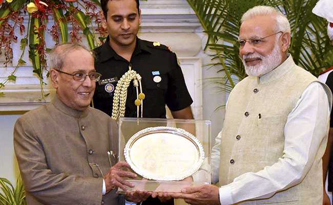 PM Narendra Modi presents memento to President Pranab Mukherjee at the farewell hosted by him.