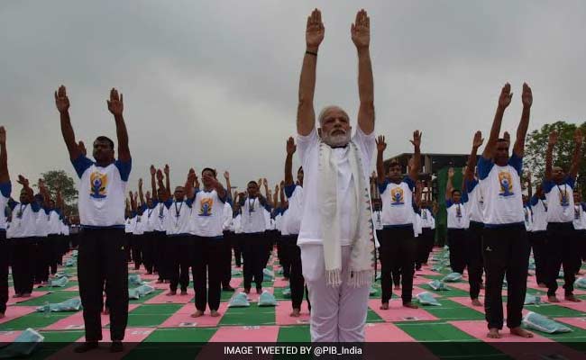 - The Prime Minister, wearing a white T-shirt and track pants with a scarf, walked around surveying people performing asanas before settling down on a mat and joining them at the Capitol Complex in Chandigarh.