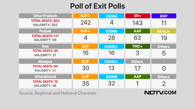In Uttar Pradesh, the Yogi Adityanath-led BJP is likely to win another term by a landslide, signal six exit polls. An aggregate of exit polls gives the BJP and its allies 241 of the state's 403 seats - the majority-mark is at 202 - with Akhilesh Yadav's Samajwadi Party finishing second with 142 seats.
