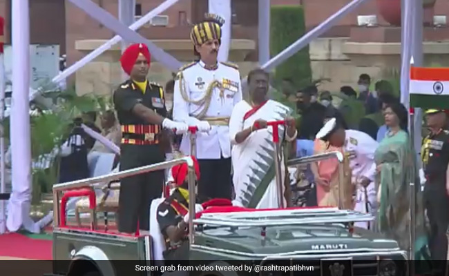After taking oath, President Murmu came back with Mr Kovind in the black limousine and inspected the Guard of Honour at Rashtrapati Bhavan's forecourt riding an open Maruti jeep.