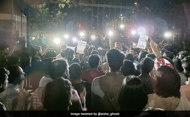 JNUSU members raised slogans against what they termed "bulldozer raj" of the Uttar Pradesh Chief Minister Yogi Adityanath-led government and held placards reading: "Stop the witch-hunt of Muslims".