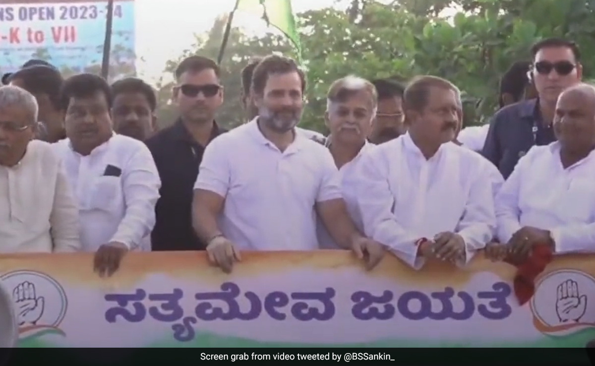 People holding Congress flags moved along as the vehicle carrying Mr Gandhi and other Congress leaders passed through the streets from Shivaji Circle and Kanakadasa Circle, amid the sound of drum beats.