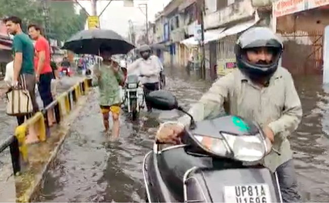 People could be seen dragging their motorbikes through knee-deep water on the streets of Aligarh in Uttar Pradesh after two days of intermittent rain. Rainwater mixed with sewage — a result of blocked drains — has entered houses, schools and administrative buildings too.