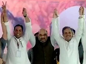 Amit Shah with Congress leader Chaudhary Birender Singh at a rally in Jind, Haryana.