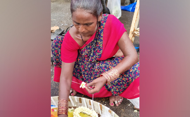Further down the road from Mr Ganesh, Mangalam, a flower seller says she has been hit hard. She has flowers worth Rs. 2,000 but hasn't sold much even on Vijayadashami. With a fuel price hike triggering a price rise, she says flowers aren't a priority for many people right now. She has taken a 30,000-rupee loan so that her daughter could go to college, the first in her family to do so. A desperate Mangalam said, "There has been no business since the Ayudha Pooja in the last three days. I set up shop in the morning and there has been no business all day".