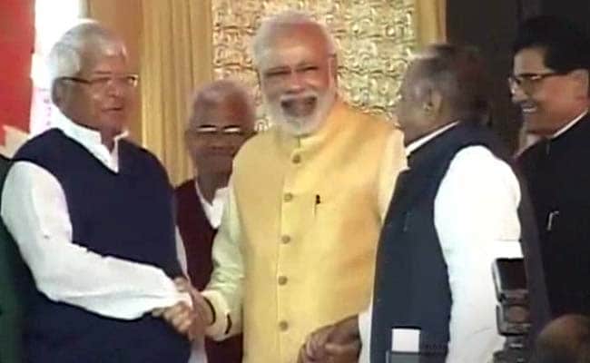 Mulayam and Lalu have been bitter critics of PM Modi and had even launched an agitation against his government in December last year. But all that was forgotten as the arch rivals smiled, shook hands, chatted and sat together. The Prime Minister and the SP chief, in fact, held hands as the latter led him onto a grand stage erected for the 'Tilak' function.