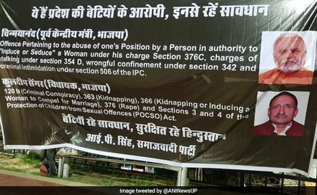 The Samajwadi Party's national spokesperson IP Singh put up a black hoarding titled in Hindi, "These are the culprits of the state, stay away from them". The banner, which also has photos of Kuldeep Sengar and Chinmayanand along with the charges against them, and came up overnight, was taken down by the police this morning.