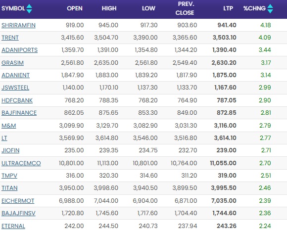 In the Nifty50 index, 49 constituents gained, except Tech Mahindra. Shriram Finance, Adani Enterprises, and Trent were the top three gainers.