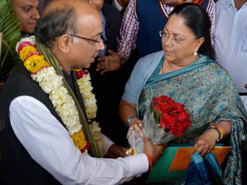 Rajasthan Chief Minister Vasundhara Raje being greeted by BJP Rajya Sabha candidate Vijay Goel after filing his nomination in Jaipur on January 28, 2014.