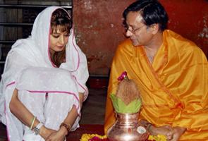 Pushkar was seated to the right of Tharoor while performing the pooja.
