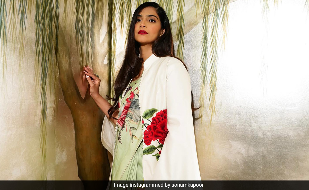 Sonam Kapoor draped a green saree with a white floral print blazer. She amped up the glamour quotient with red earrings and a green stone ring. She raised the glam quotient with bold red lipstick with minimal makeup. This saree is from the shelves of the designer Rohit Bal.