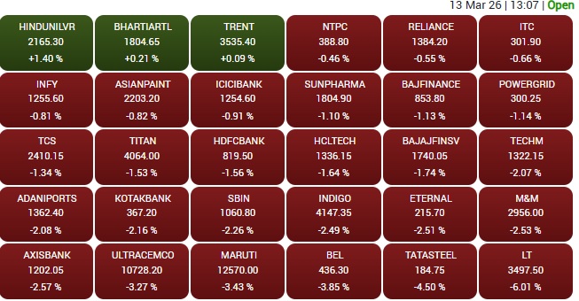 Sensex extended losses after opening, dropping 805 points to trade at 75,173 at 9:58 am.