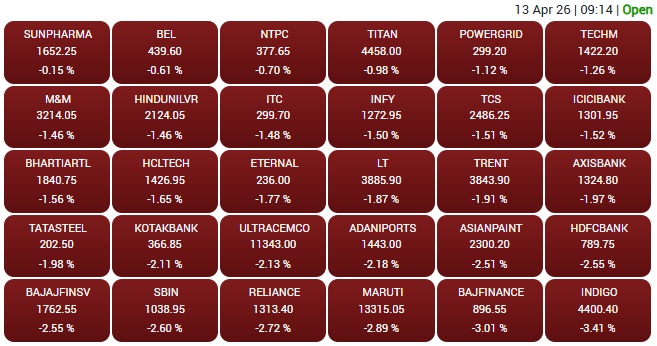 Among the Sensex constituents, barring Sun Pharma, all other stocks opened in red. IndiGo, Asian Paints, Bajaj Finance, Maruti Suzuki, and Bajaj Finserv were the top losers.