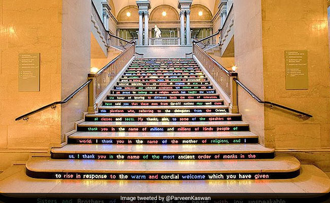 On Swami Vivekananda's birth anniversary today, a post on Twitter made his famous speech at the World Parliament of Religions in Chicago come alive. Words of the landmark speech delivered on September 11, 1893 illuminate the stairs of the Art Institute of Chicago, then known as the Permanent Memorial Art Palace, where the World Parliament of Religions was held. The rise of each step has Swami Vivekananda's lines, starting with his opening words - "Sisters and brothers of America, it fills my heart with joy unspeakable to rise in response to the warm and cordial welcome which you have given us. I thank you in name of the most ancient order of monks in the world; I thank you in the name of the mother of religions; and I thank you in the name of millions and millions of Hindu people of all classes and sects...".