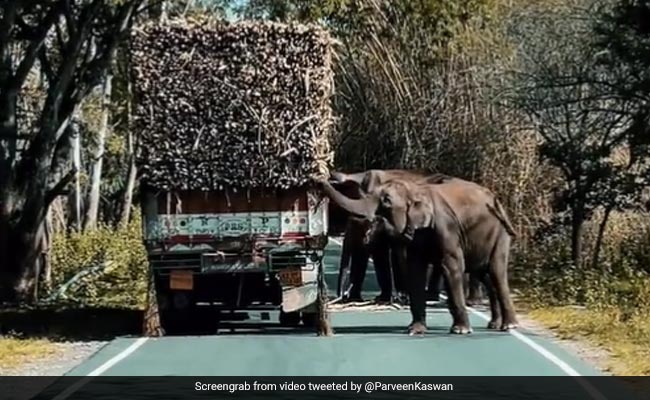 In the short clip, two elephants, one of them a calf, are seen obstructing the way of a sugarcane-laden truck. A person standing atop the truck starts tossing bundles of sugar cane to the elephants. As soon as the bundles land, the elephants move to the roadside and immediately start feasting on them.