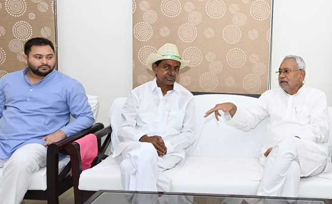 In his latest outreach move aimed at stitching together an alliance of like-minded parties against the Bharatiya Janata Party, Telangana Chief Minister K Chandrashekar Rao today met Bihar Chief Minister Nitish Kumar and his deputy Tejashwi Yadav in Patna. The leaders are scheduled to appear at a few events before heading for lunch. Mr Rao, sporting a fedora hat, posed for pictures whil being welcomed with flower bouquets by his Bihar counterpart and Rashtriya Janata Dal Chief Mr Yadav. The three leaders are expected to discuss national politics.